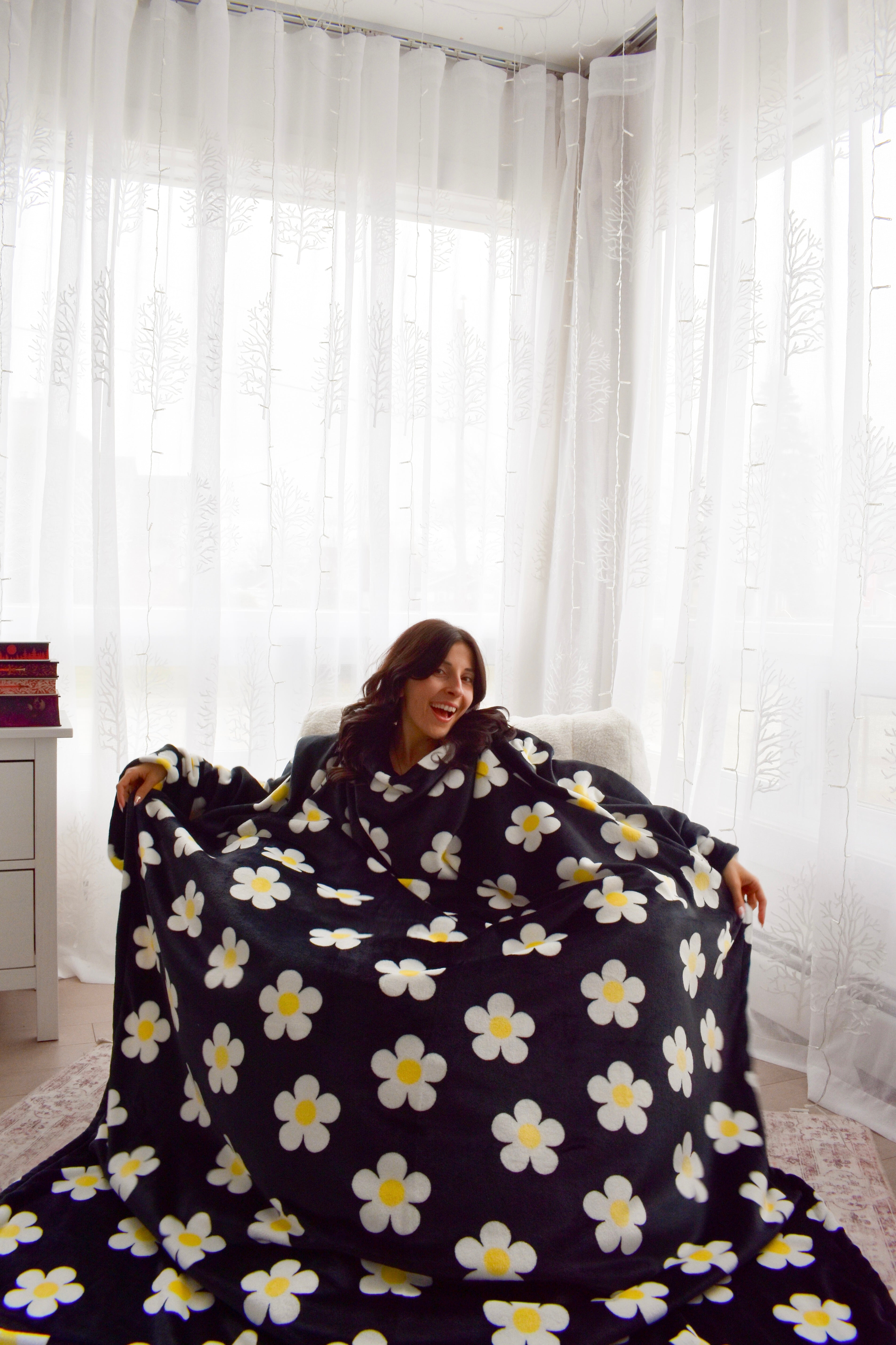 Elles sont parfaites pour t'emmitoufler dedans sans problème! Tu va même pouvoir la replier sous tes pieds si tu prend le format adulte :)